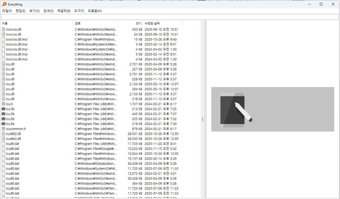 윈도 검색과 달리 Everything은 처음에 컴퓨터에 있는 모든 파일과 폴더를 보여줍니다(그래서 이름이 그렇습니다).