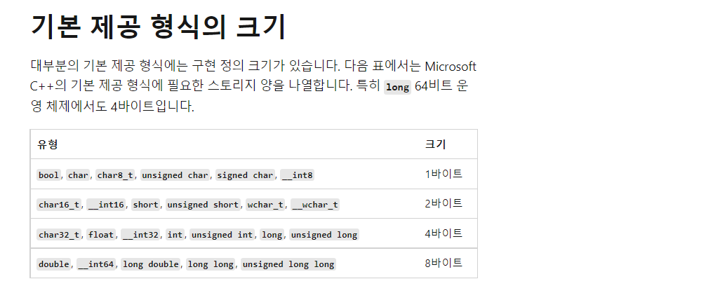 | 번호 | 유형이름 | 크기 | 범위 | 다른정의 | 비고 |